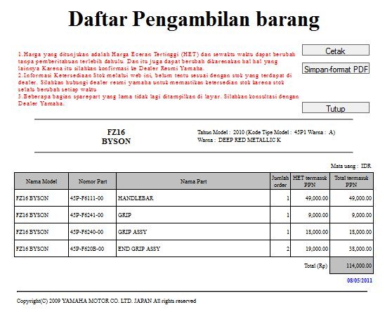 HARGA STANG YAMAHA BYSON 5 Agustus 2011