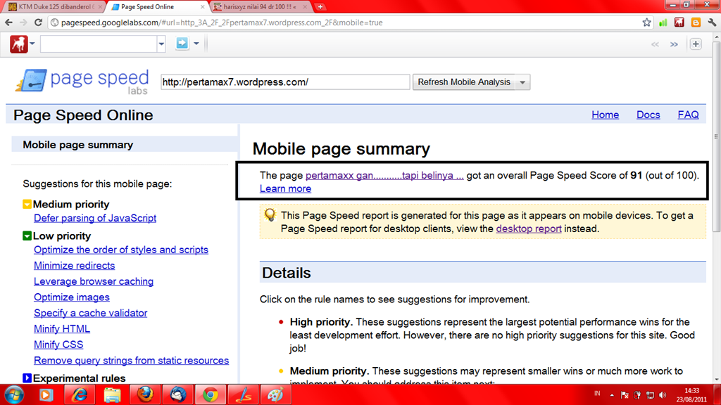 pertamax7 dapet nilai 91/100 di pagespeed.com untuk mobile 23 Agustus 2011