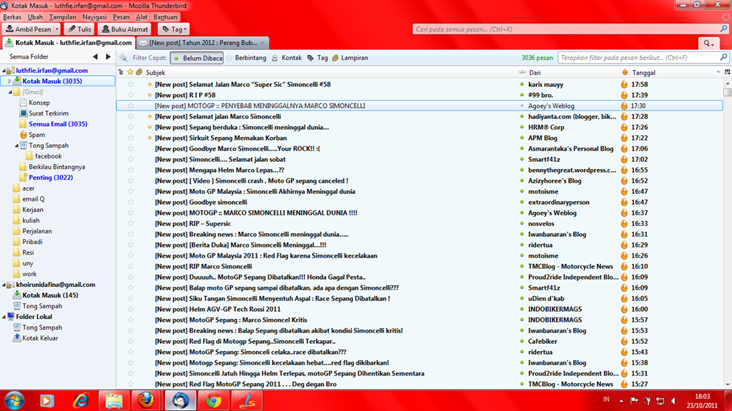 Marco Simoncelli  nikung, ndlosor, helmnya lepas, eh ketubruk oleh Colin Edwards dan Valentino Rossi yang lagi mbalap di belakangnya. Red flag dan balapan dihentikan, sampe ada kabar kalo Marco Simoncelli   meninggal dunia .