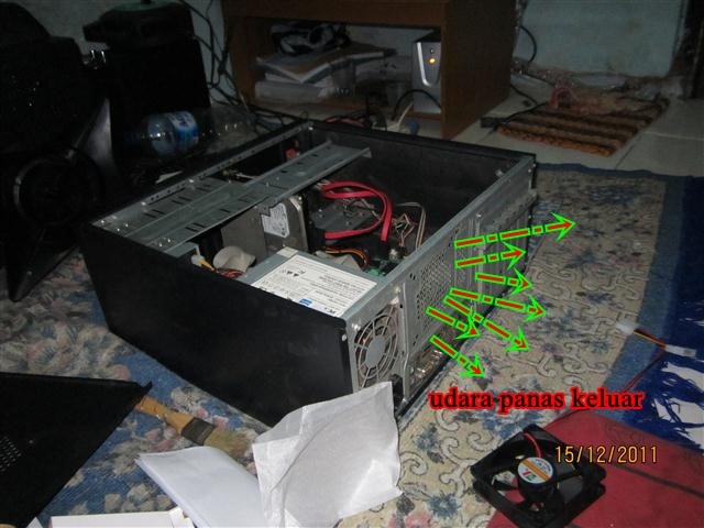 ingat, udara oanas dalam casing di buang keluar, bukan sebaliknya, udara luar dihisap kedalam casing, entar udaranya malah muter2 ngak jelas di dalem, check thic pict’