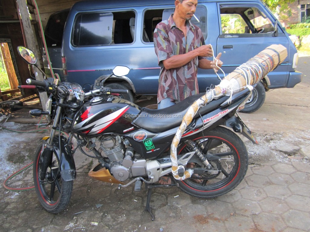 ane bawa knalpot tiger yang besar bin berat ini dari jogja ke wonogiri dengan metode tali temali pramuka sepanjang 20 meter, ludes juga, eh menempuh 130 km dengan aman walau topspeed 60 km/jam aja,