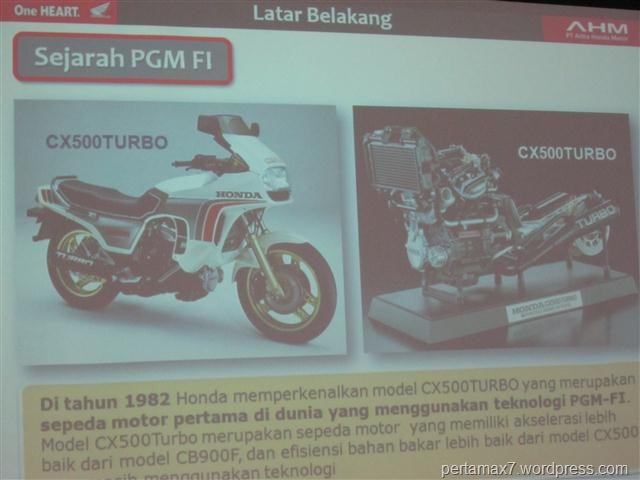 2. sejarah PGM-FI dimulai tahun 1981 ( ane belum lahir ) yang diaplikasikan di motor honda CX500TURBO ( bukan motor CXnya lek ari lhoo , beda jauhhhh Open-mouthed smile ) pada tahun 1982