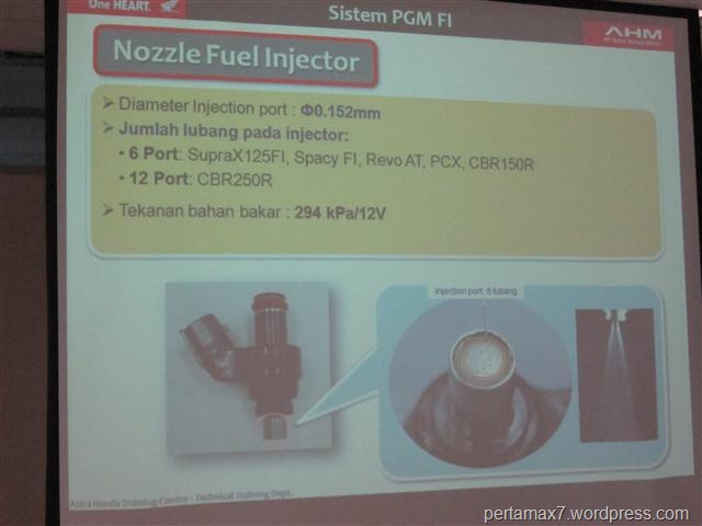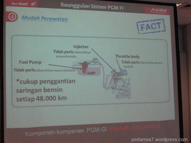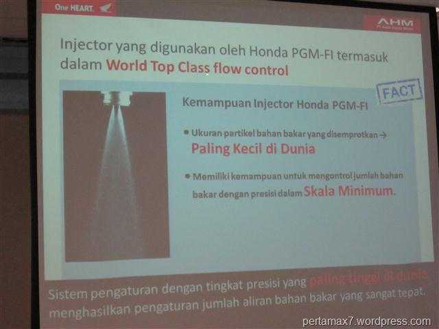 21. katanya pihak independen sih injektor yang digunakan di Honda PGM-FI sistem  mampu menyemprotkan bahan bakar dengan ukuran partikel paling kecilll dan memiliki kemampuan mengontrol bahan bakar secara presisi dengan bentuk yang KECIlL pula, wow