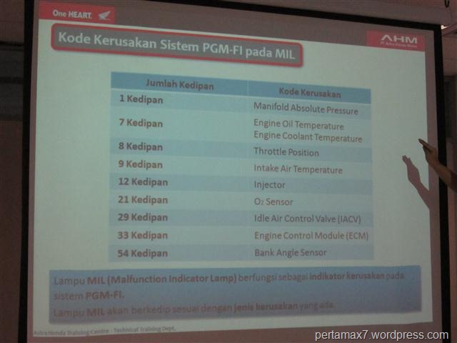 31. di sistem PGM-FI bila terjadi ketidak beresan pada sistem injeksi, maka akan mengeluarkan tanda tanda berupa kedipan lampu MIL ( malfunction indikator lamp ), yang berkedip sesuai kerusakan