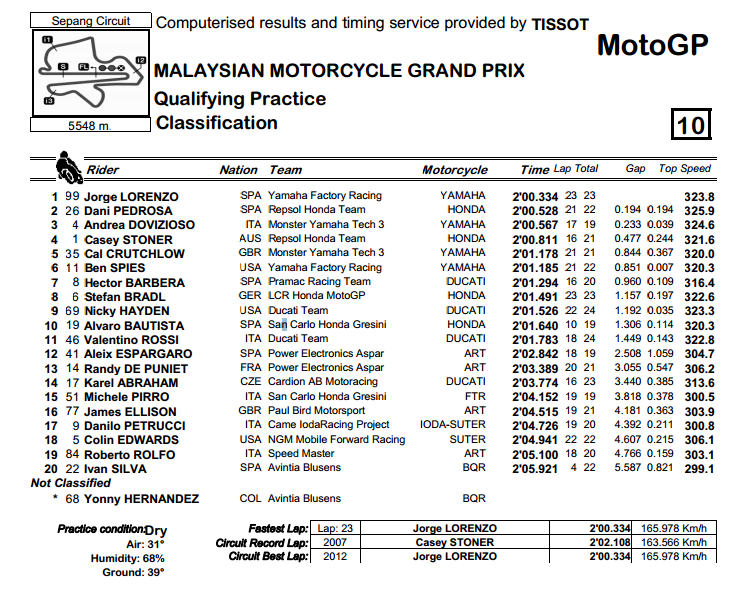 Qualifikasi motogp sepang malaysia, lorenzo pole position,, mampukan pedrosa membuat kejutan dan keajaiban? 20 Oktober 2012