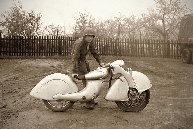 This is one of the most unusual motorcycles I’ve seen in a long time: it’s a ‘Killinger und Freund’ built in 1935 in Munich, Germany. The art deco styling is obviously eye-catching, but it’s hiding something even more interesting: this machine has a driven front wheel, like the Rokon. And underneath that huge front fender is the engine itself. The motor is a sizeable 600 cc two-stroke triple—or perhaps three one-cylinder engines joined together. Yet the bike was reportedly very light, at just 135 kg. There’s obviously a story behind this picture too: is the soldier an American who found the bike in the dying days of the war, and posed for a picture taken by a colleague? The Allies rolled into Munich on 30 April 1945, and Wikipedia reports “One motorcycle was discovered by the US Army in the spring of 1945 at a German military installation, but it is not known if this was the original prototype or another Killinger und Freund Motorrad.” If you can cast any further light on this oddity, please let us know. [Thanks to Adam Zerbib.]