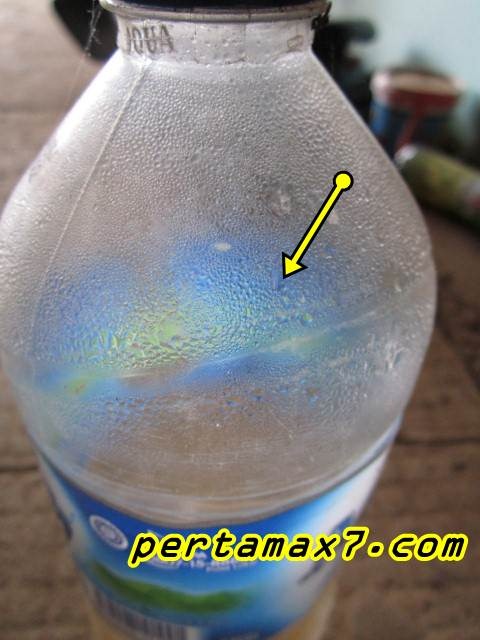embun? itu uap bensin pan, bensin kan gampang nguap, uapnya nempel di dinding botol. bukan plastik larut, hadeh…