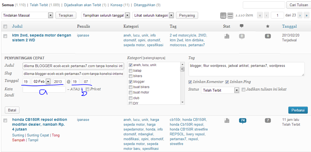 Posted by ipanase in aneh, lucu, unik, blogger, info otomotif, opini.Tags: blogger, fitur wordpress, jadwal artikel, pertamax7, wordpress
