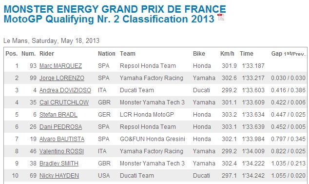 kualifikasi motogp Le manS France 2013 Marc Marquez terdepan disusul Lorenzo valentino rossi start nomer 8 19 Mei 2013