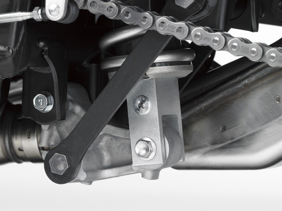 Bottom-Link Uni-Trak, gas-charged shock with piggyback reservoir and stepless rebound damping and preload adjustability