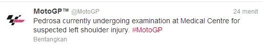 Menurut Laporan tim medis tidak ada faktor tulang retak pada bahu Pedrosa… Yg ada hanya laporan Mental Tempe nya yg semakin besar…
