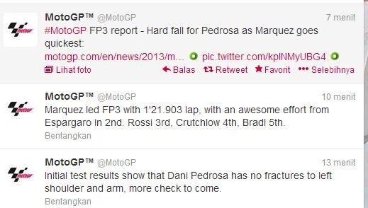 Moga2 Pedrosa bs ikut race besok, kasian jg kalau kerja keras dan perjuangannya slma ini tdk jg mmbuahkan hasil(juara dunia). Sdh bersama repsol dari thn 2006, mdh2an thn ini dia juara dunia. Walau dia bukan favorit sy, tapi sy simpati sm Pedrosa.