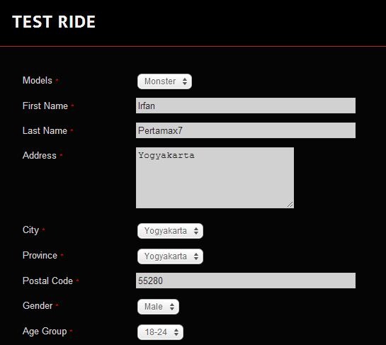 dari model ducati yang mau di testride ( ane mau nyoba monster :mrgreen: ), isi nama, nama belakang, alamat, kota, porvisi, kode post, jenis kelamin dan umur…