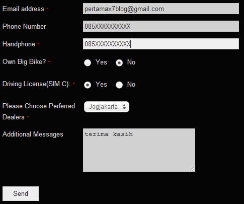 isi alamat email,  kasih nomer telpon, hape, ane belum punya motor gede ( doain ya gan, AAMIIN ), kemudian punya SIM C ( jelas (y) ), dealernya ane ngambil jogja…. ( ngambil, siapa tahu bisa kredit :v )… kasih pesan apa gitu, thanks.. atau DESMO 😀
