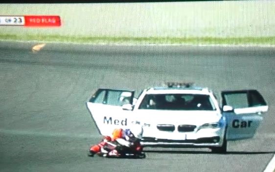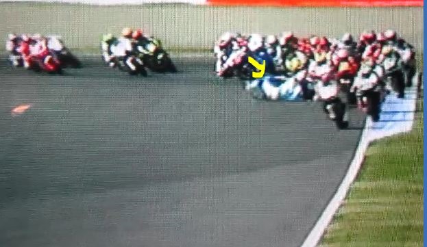 Dominique Aegerter also crashed on first lap, he has been checked over, his bike fixed and he intends to race. Will start from back of grid.