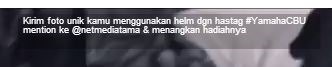kirim foto unik kamu menggunakan helm dengan hastag #YamahaCBU mention ke @netrmediatama dan menangkan hadiahnya…