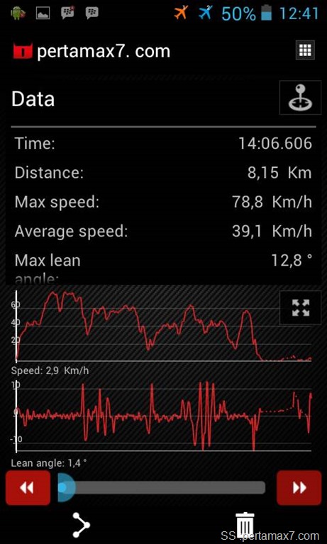 keren….. nampilin data jarak, waktu tempuh, keceparan rata-rata, kecepatan puncak, dan lean angle ( 12,8 derajat cuma buat belok dikit2 :mrgreen: )