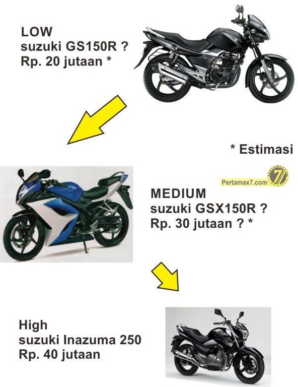 dengan bocoran mesin 4 klep ( entah dohc atau sohc ), dan berpendingin ( entah water cooled atau oil cooled khas suzuki )….. injeksi dan 6 speed kabar om laskar…. dengan pricing bisa jadi over Rp. 30 jutaan, terlihat suzuki bermain di level low dengan suzuki GS150R ( perkiraan pengganti suzuki thunder ) di kelas naked 150 , di level tengah dijaga suzuki GSX150R ( prakiraan suzuki fairing 150 ) dengan harga India Rp. 20,7 jutaan dikelas 150 fairing , serta di kasta tertinggi suzuki inazuma sohc 2 klep perpiston di kelas 250