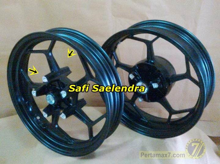 velg bikinan chemco ini berukuran depan 3 Inchi ( lebih lebar 0,25 inchi dari aslinya )  dan belakang 4,5 inchi saja ( lebih lebar 0,5 inchi dari aslinya )…. yang bikin asyik yakni ketersediaan tempat baut buat disk kembar kanan kiri di velg depan atau lazimnya disebut front dual diskbare seperti terpampang pada gaambar 2…. untuk harganya sendiri dikatakan Rp. 3 jutaan ( velgnya ), so bagi yang mau pasang, siap2 Rp. 10 jutaan lah ( syukur2 sisa banyak lagi 😀 ) buat beli