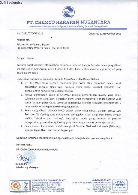 Velg Chemco balik lagi, tegaskan Chemco hanya buat Velg Chemco 11 Desember 2013