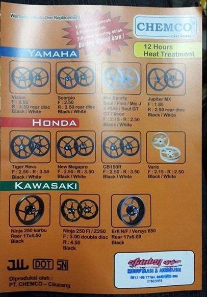 mengenai peredaran velg chemco ini, bermunculan pedagang online murni maupun pedangan toko yang dijual online juga ada, seperti gan safi atau gan Stanley Modifikasi MotorBekasi di facebook, makin rame pilihan velg buat motor….. dengan merk chemo