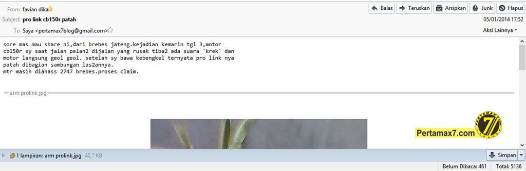 baru aje sampai rumah buka email,, lah dalah,, ada kiriman pemirsa kemaren aka tangga 5/1/14 mengenai honda CB150R yang mengalami patah dudukan prolink..