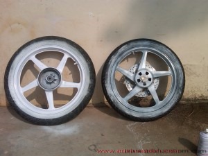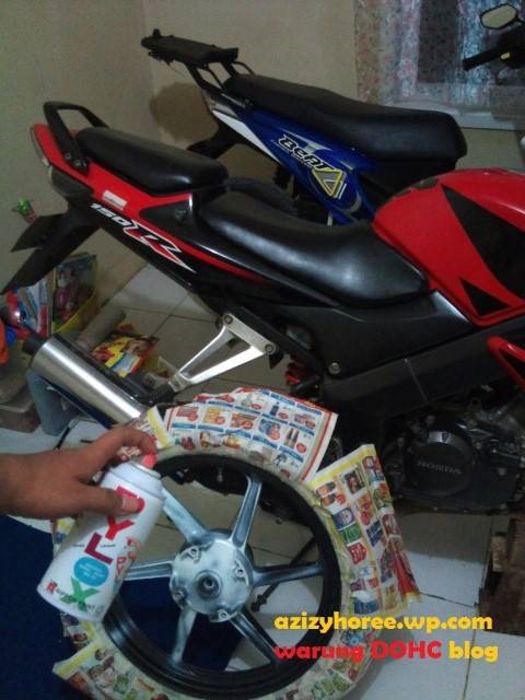^ suhu dohc ngecat velg minerva eh honda cbr 150 dohc aslinya dengan membungkus pakai koran supaya ndak usah copot ban luar,,, tapi ane dulu kala sempet baca,,, ada teknik lain yakni pakai sabun colek mas bro,, unik tenan…