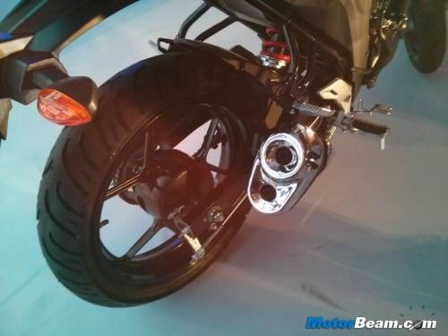 yang bikin heran, kenapa nih motor tidak dikasih fitur wajib yakni SAREE GUARD , jawabanya adalah karena motor ini baru akan di lempar Juli 2014 mendatang,, mungkin versi jalananya dikasih..IMHO