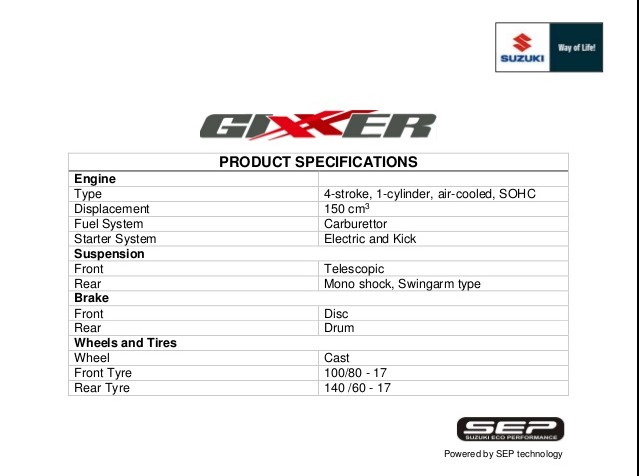 tebakan om motorbeam sih power suzuki GIXXER ini bakal diatas suzuki GS150R dengan power 13,8 BHP, torsi 13,4 Nm dan 6 speed……