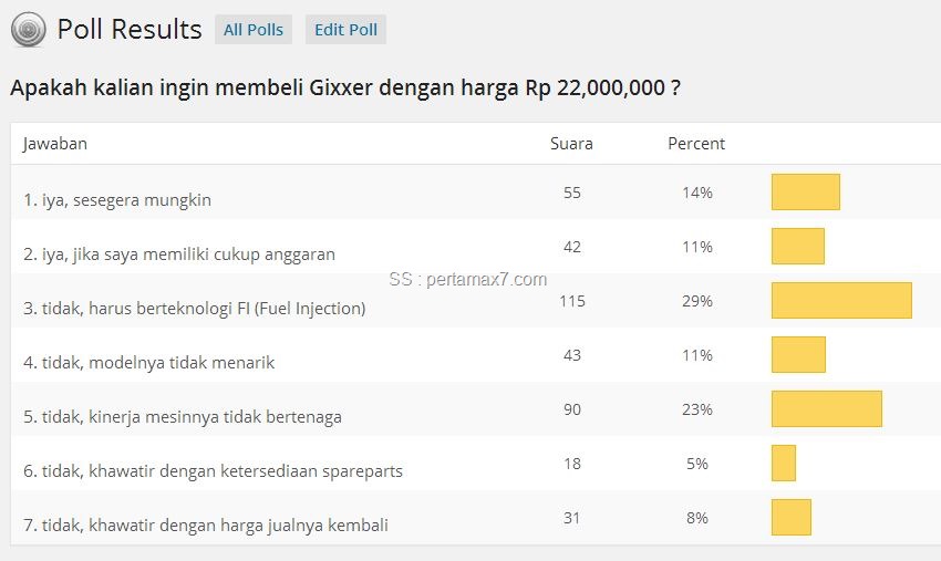 hasil pollingnya dengan angket yang ane ambil dari polling suzuki motor indonesia ( sudah dihapus ) pemirsa pertamax7.com menyatakan………
