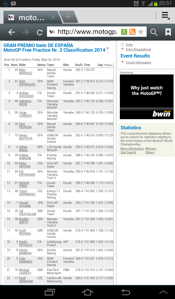 Berbekal android selebar daun jati,, ane cuma bisa mengetahui hasil free practice 2 motogp jeres, dan hasilnya ente maning ….