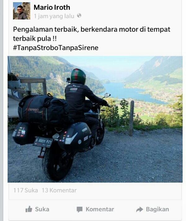 Mario iroth turing motor antar negara tanpa sirene toa dan lampu strobo 4 Oktober 2015