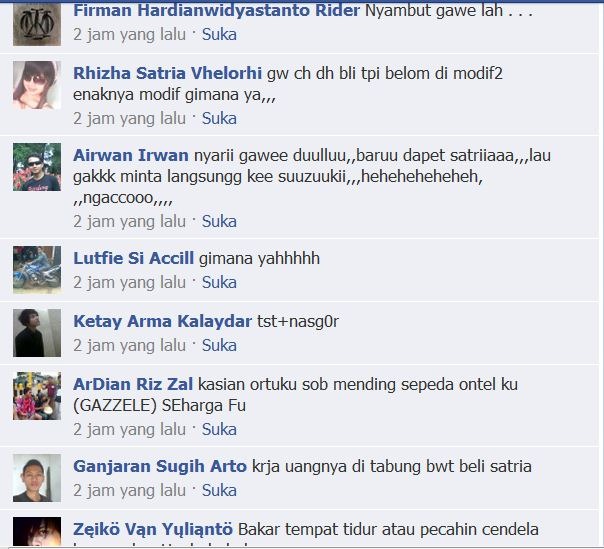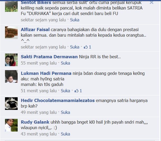 Posted by ipanase in aneh, lucu, unik, info otomotif, opini, otomotif, sepeda motor.Tags: alay, ban cacing, ban drag, berani gila, durhaka, fans page suzuki indonesia, fb, FU, modifikasi satria f, pertamax, pertamax gan, pertamax7, safety riding, satria f, satria FU, sepeda motor, suzuki, suzuki motor indonesia, suzuki satria FU