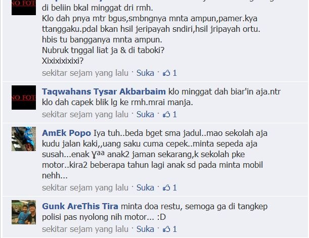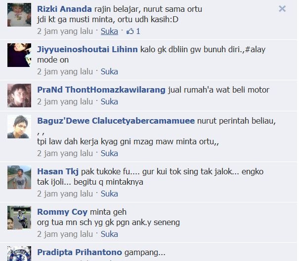 minta motor sih syah syah saja, selama orang tua mampu dan dah 17 tahun punya SIM,,,TAPI KALAU ALAY< NGGAK PUNYA SIM< MAKSA ORANG TUA SAMPE NGANCAM BUNUH DIRI dan lain lain,,,,,,??? DURHAKA !!!!!