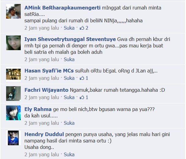 b. suruh ortu begal orang dijalan ( anak KEPARAT, nyuruh ortu berbuat kejahata,,,,busuk meneh )