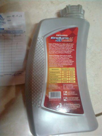 karena ane baca dari temen2 klub, temen meggi, temen vixi, temen NSS blog, yang mereview oli enduro 4 T racing , katanya enag,,mantatatap, plus temen ane yang megginya keluar 22 HP ( dyno on the wheel ) pake oli ini juga ane penasaran n mau coba,hahaha
