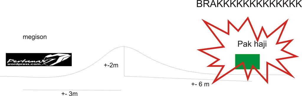 megison melaju kencang( 50-60 km/jam dah kencang bagi ane ) dari arah utara, lepas gas karena tuh jalan LURUSnamun ada bukit kecil aliasa model CILUK BA, pas turun koq ane gas lagi, eh ada pak haji jalan mau nyebrang ke kiri jalan, KLAAKSONNN keong TUTTTTTTTTTTTTTTTTTTTT, ane banting stang megison ke kanan, ngerem sejadi-jadinya, sampe bunyi cittttttttttttttttttttttt eh apesnya pak haji kena stang kiri megison, pak haji terguling2 ke aspal, ane pun sukses ndlosor bareng megison