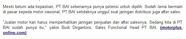 Meski belum ada kepastian, PT BAI sebenarnya punya potensi untuk dipilih. Sudah lama bermain di pasar sepeda motor nasional, PT BAI setidaknya unggul soal jaringan distribusi juga after sales.