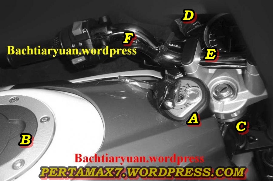1. kunci kontak nemplok di tangki, dah ngaplikasikan SKS, n bentuknya katanya komentator di blog penggede otomotif sih cuma SKS yamaha XEOn bulet atau fino ( sks yamaha ane kurang apal ) yang di templokin kesono, cxixixi 😀 ndagel , n ane pikir2 kalau ngunci stangnya gimana, paling ada mekanisme kabel ( olor mirip kabel gas ) penghubung dengan mekanisme pengunci stang, hmm, kayak buka jok via kunci kontak depan itu tu