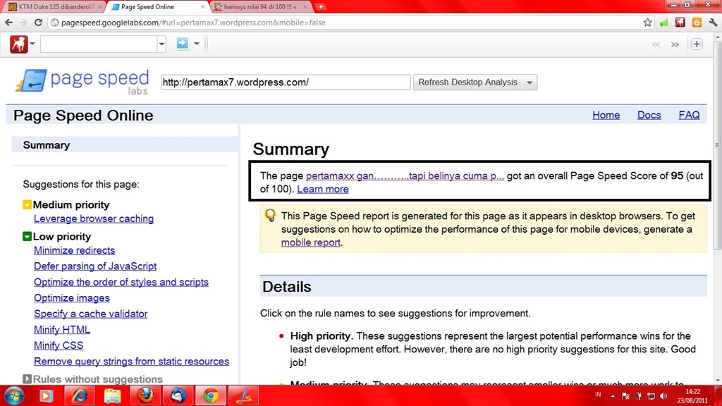 pertamax7 dapet nilai 95/100 di pagespeed.com 23 Agustus 2011