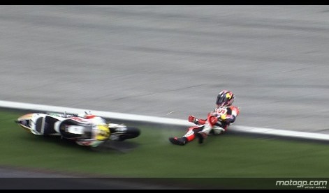 kejadian ini terjadi saat FP 4, om bradl kehilangan grip depannya di tikungan pertamax .. alhasil yaw ndlosor gan..