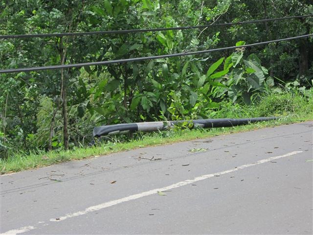 eh,,3 km menuju rumah, banyak seng atap rumah yang pada TERBANG,,,bikin takut aja,,ada yang nangkring di pohon,jalan, sungai, dkk..sampai suatu ketika tiang telepon roboh dan kabelnya terjuntai ke jalan ( ini ane ambil gambarnya,,,,,)