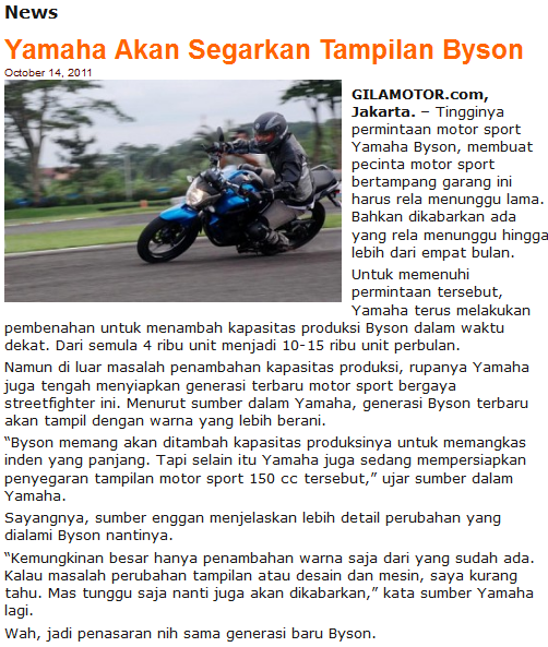 Yamaha Akan Segarkan Tampilan Byson 14 Oktober 2011